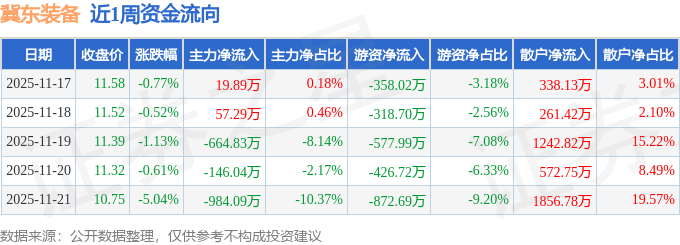 证券之星音讯,到2025年11月21日收盘,冀东配备(000856)报收于10.75元,较上星期的11.67元跌落7.88%。本周,冀东配备11月17日盘中最高价报11.75元。11月21日盘中最贱价报10.7元。冀东配备当时最新总市值24.4亿元,在专用设备板块市值排名163/177,在两市A股市值排名4868/5167。