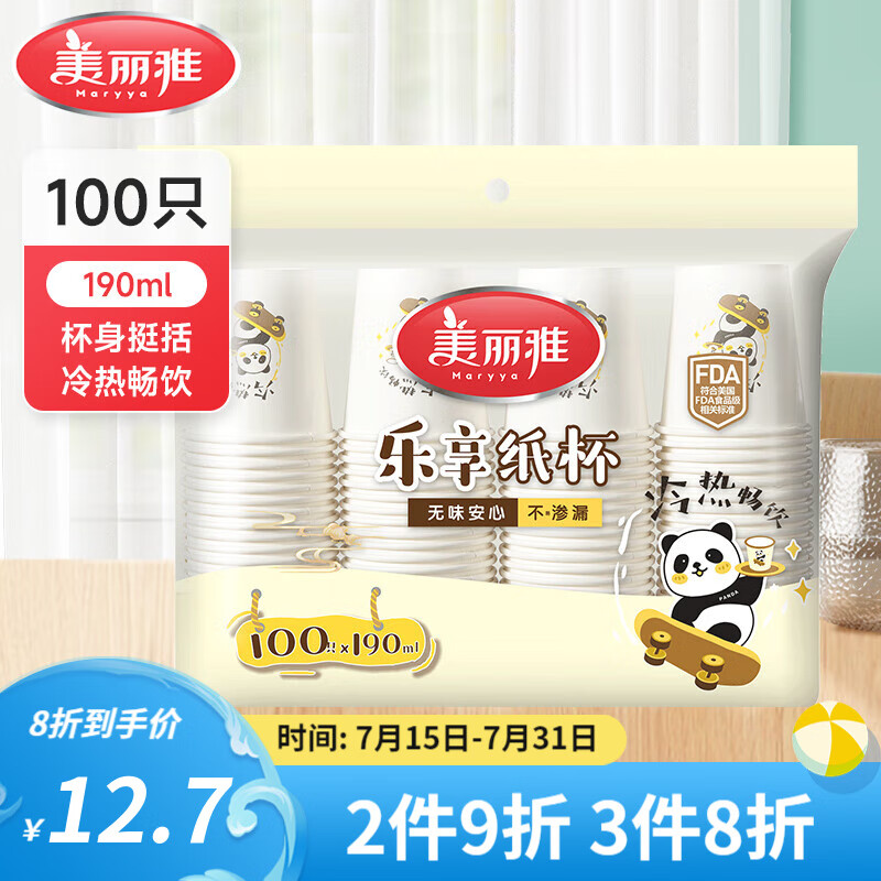 美丽雅纸杯 一次性杯子 加厚本性熊猫 饮料果汁茶叶水杯 工作商务家用 【乐享纸杯】190ml*100只